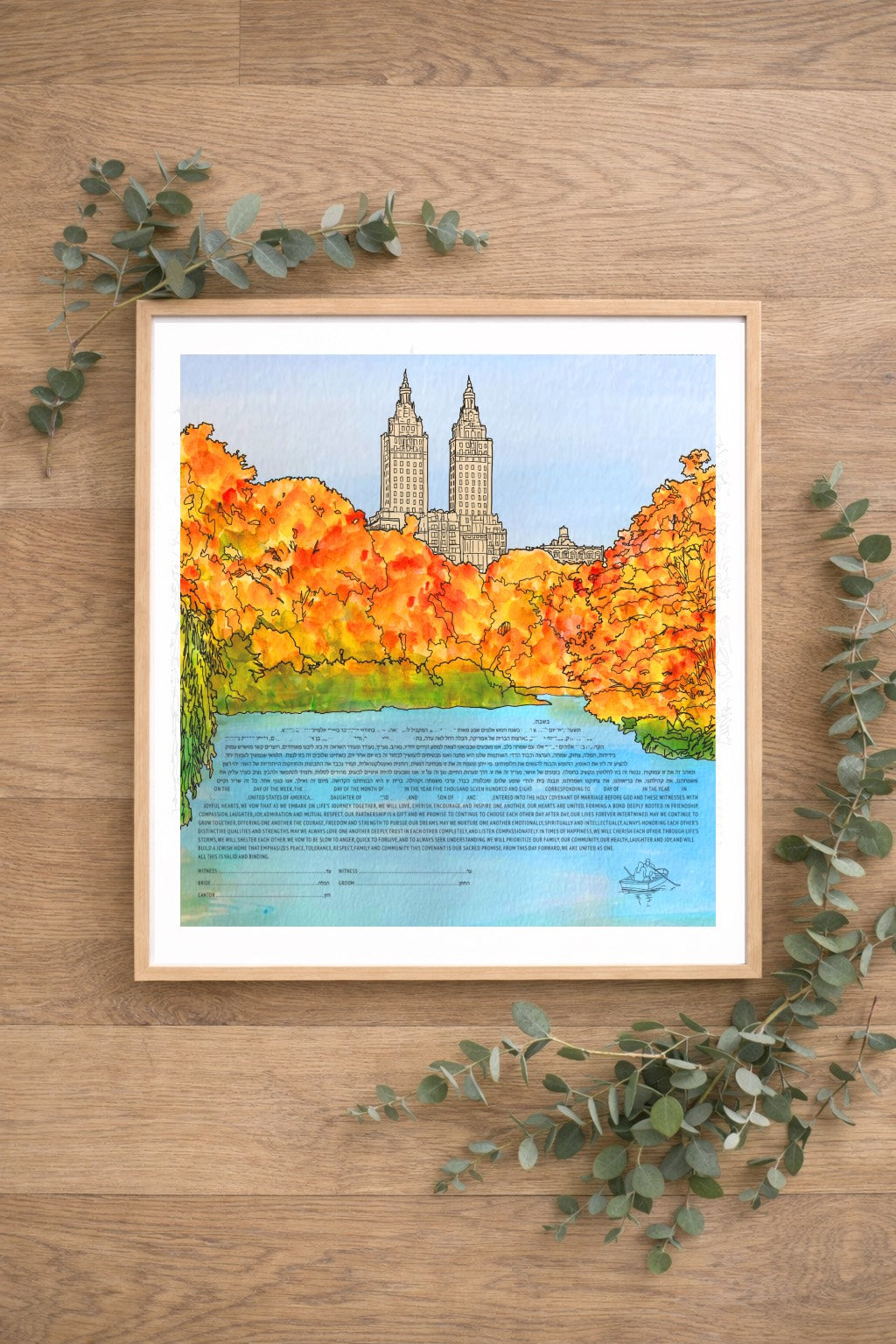 The Central Park ketubah is part of our Landmark ketubah collection, offering a timeless and vibrant design available for quick shipping. If you and your partner cherish the beauty and energy of Central Park—whether through leisurely walks along its winding paths, meaningful moments beneath its iconic trees, or a shared love of New York City’s most beloved green space—this ketubah is a perfect tribute to your story. Hand-drawn and digitally edited, with fully customizable text provided by the customer.